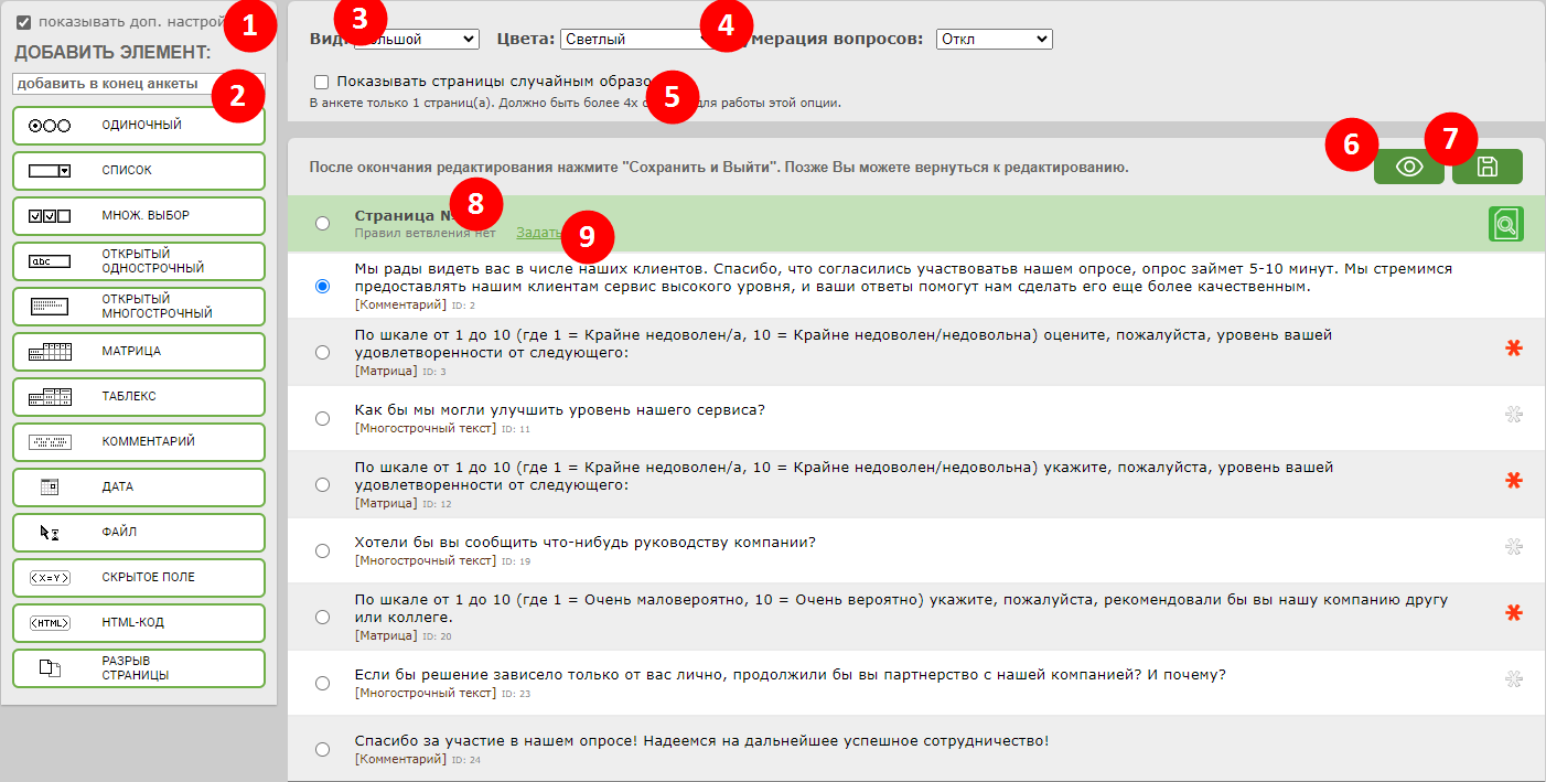 8. Страница - начало новой страницы анкеты. По умолчанию в анкете одна страница, вы можете разбивать анкету на страницы путем добавления элемента "Разрыв страницы" в нужном месте анкеты.