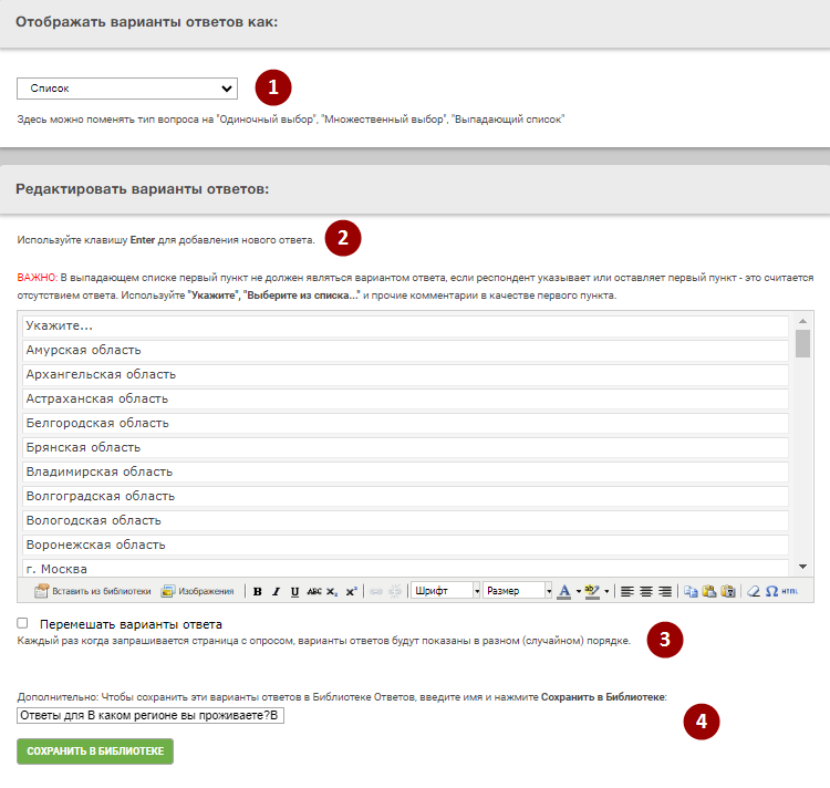 4. Сохранить в библиотеке - сохраните список вариантов ответа в библиотеке, для последующего быстрого использования в этой и других анкетах.