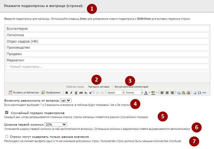 1. Укажите подвопросы - каждая строка это вопросы, которым будут соответствовать строки в матрице. Текст отобразится в левой колонке.