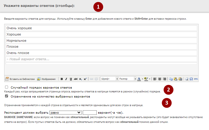 3. Ограничение на количество выбранных вариантов - (только для матриц с множественным выбором) вы можете ограничить количество выбираемых вариантов в строке матрицы, указав количество вариантов, которые должен выбрать респондент (включая варианты меньше или равно, больше или равно)