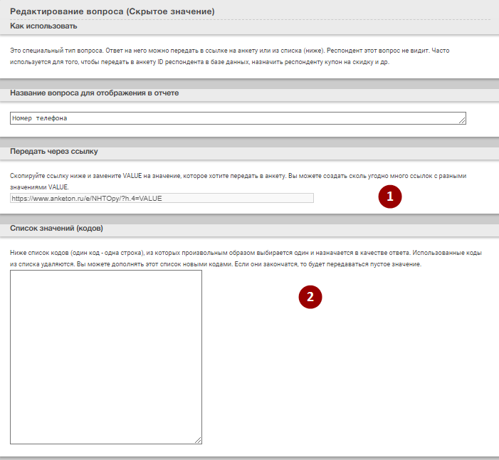 Это специальный тип вопроса. Ответ на него можно передать в ссылке на анкету или из списка (ниже). Респондент этот вопрос не видит. Часто используется для того, чтобы передать в…