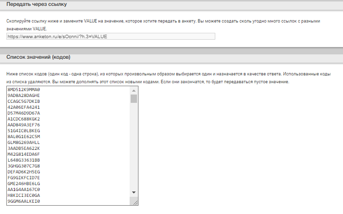 2. Список значений (кодов) - укажите список кодов, каждый из которых будет назначаться новому респонденту и заноситься в отчет. После назначения код из списка удаляется. Используйте, например, для раздачи респондентам индивидуальных купонов на скидку. Если коды заканчиваются, то передается пустое значение.