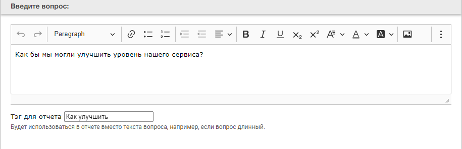 Текст вопроса - текст, который будет показан респонденту, впишите сюда вопрос или текст (для комментариев и скрытых полей). Также этот текст используется в отчетах. Используйте редактор для форматирования и вставки изображений