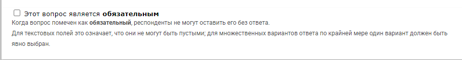 Сделать вопрос обязательным. Если респондент не ответит - он не сможет продолжить заполнение. Обязательными следует делать вопросы, на которые ответ необходим и/или для вопросы, от которых зависят логические скрытия и переходы между страницами. Не рекомендуется делать обязательными все вопросы в анкете, если исследование не требует этого.