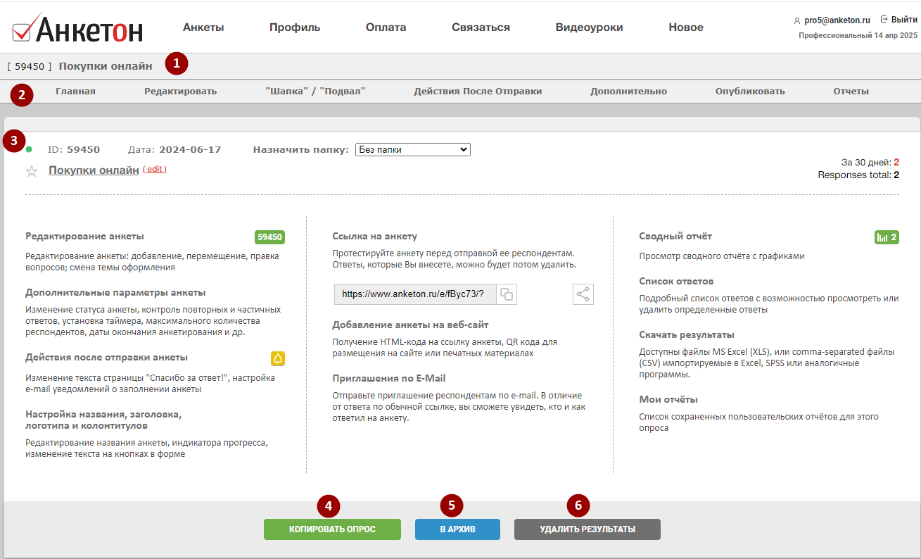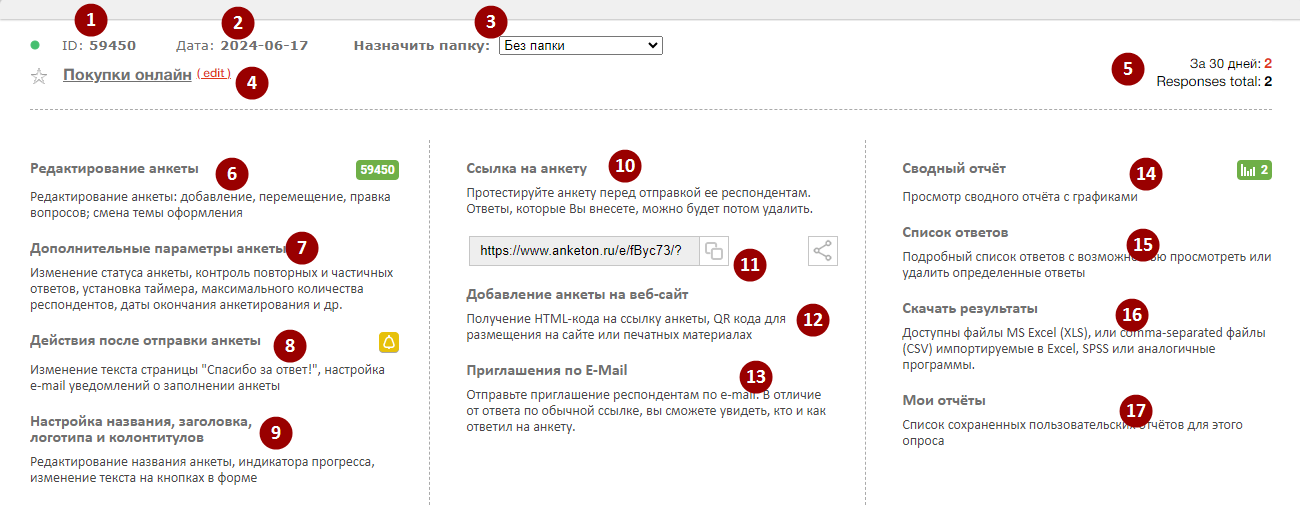 - Редактирование анкеты[link] - переход в конструктор анкеты[link], где задаются вопросы анкеты, варианты ответов, а также тема оформления
