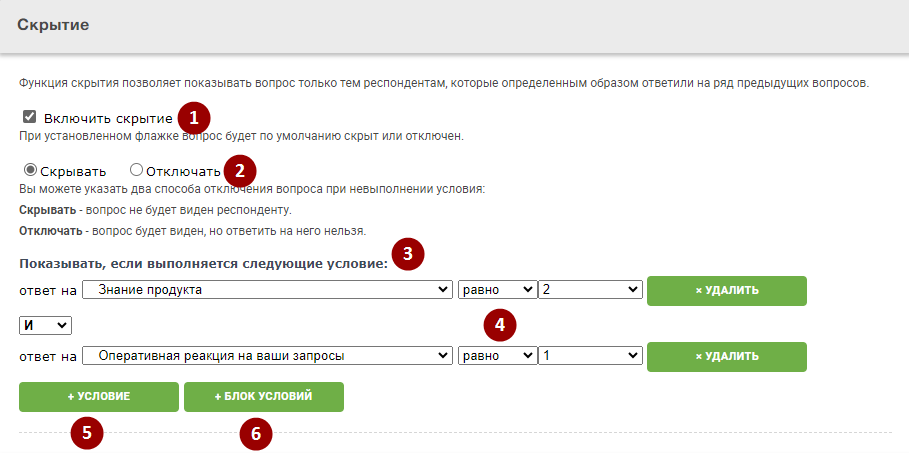 5. Добавить условие - добавляет еще одно условие, таким образом, вы можете задавать сложную логику показа вопросов, например, "показать вопрос, если пол=женский И возраст = 25-30 лет". Условия могут объединяться с помощью И (условия должны выполняться одновременно) и ИЛИ (любое из условий должно быть выполнено)